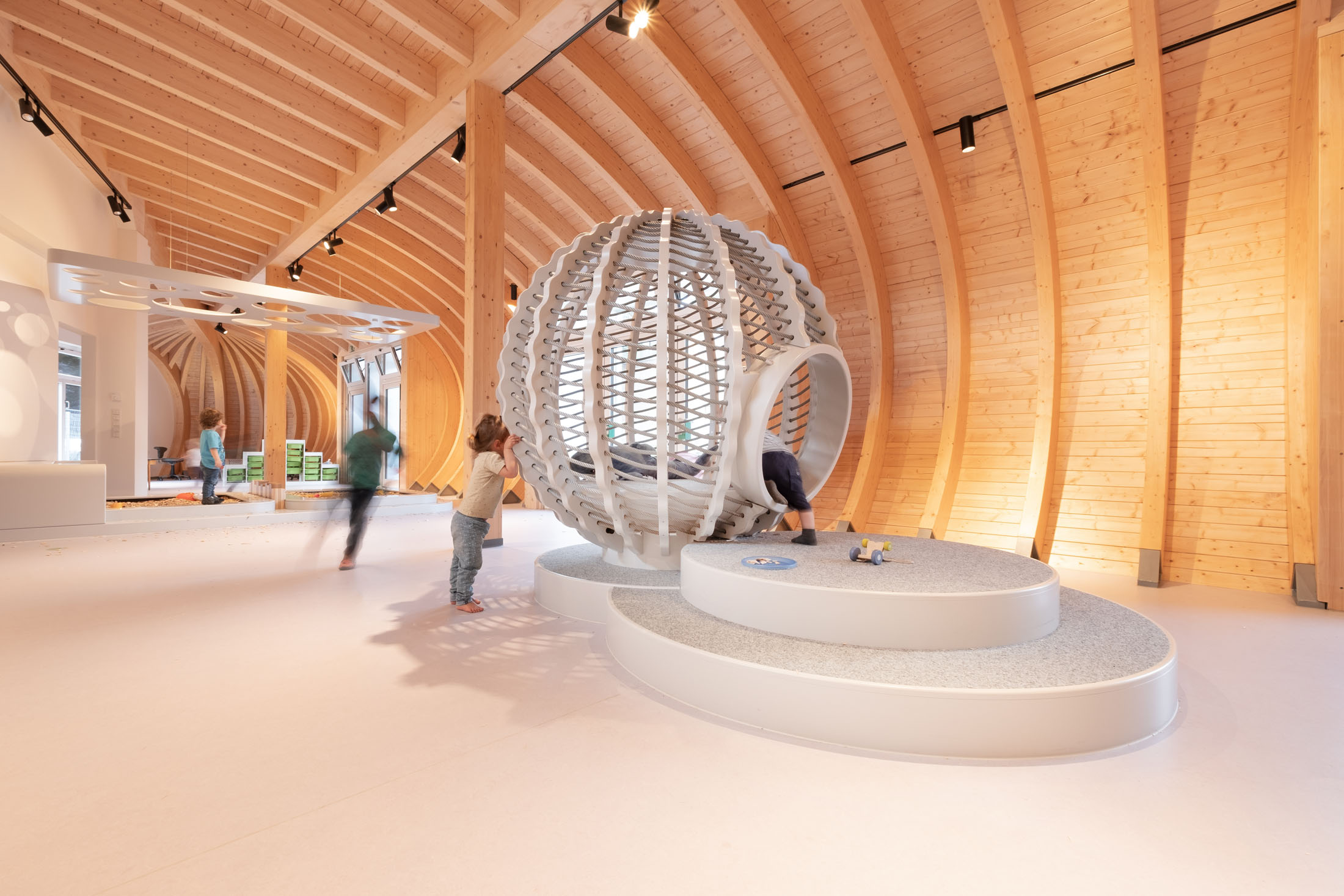 The idea was to create an observable place of retreat as part of an open room concept for all age groups. The special feature of this nest is that it is spherical and simultaneously the kids can still observe everything. Children especially love experiencing this cave of theirs in twos or threes, inside and outside. Why is it that all the kids always want to play here?